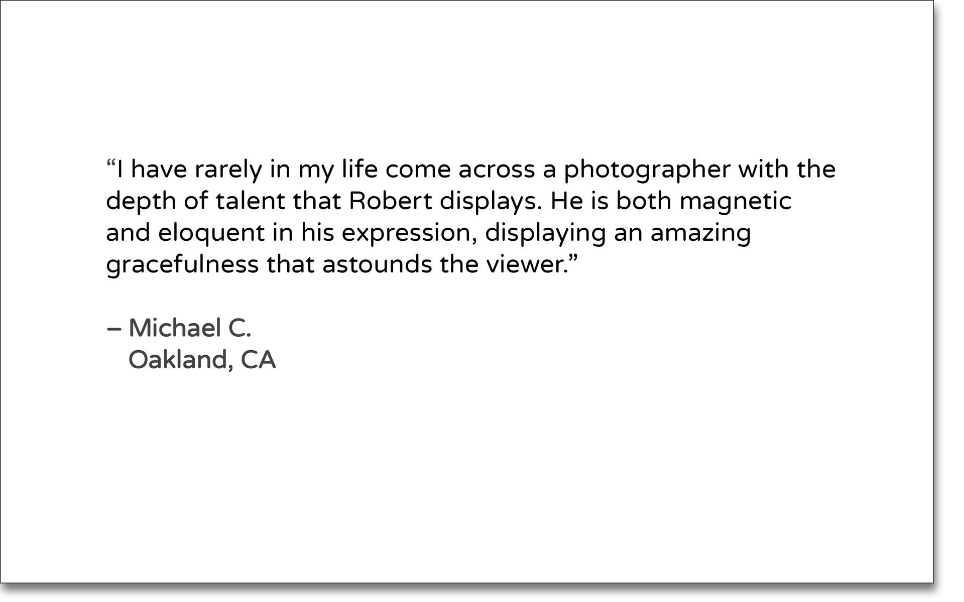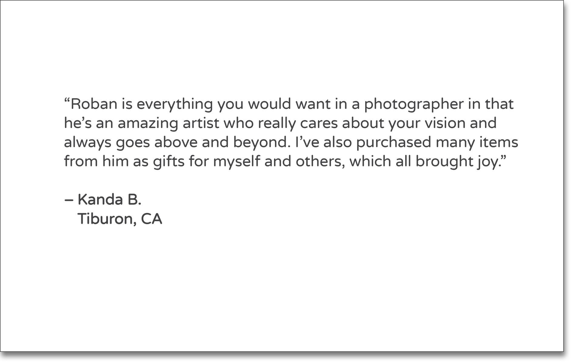 “Roban is an incredibly gifted photographer. He captures an essence of authenticity in his portraits that distinguishes him from the rest. He produced exactly what I was hoping for and I couldn’t have been happier. He’s knowledgeable, professional and a delight to work with. I look forward to working with him again. Highly recommended!"