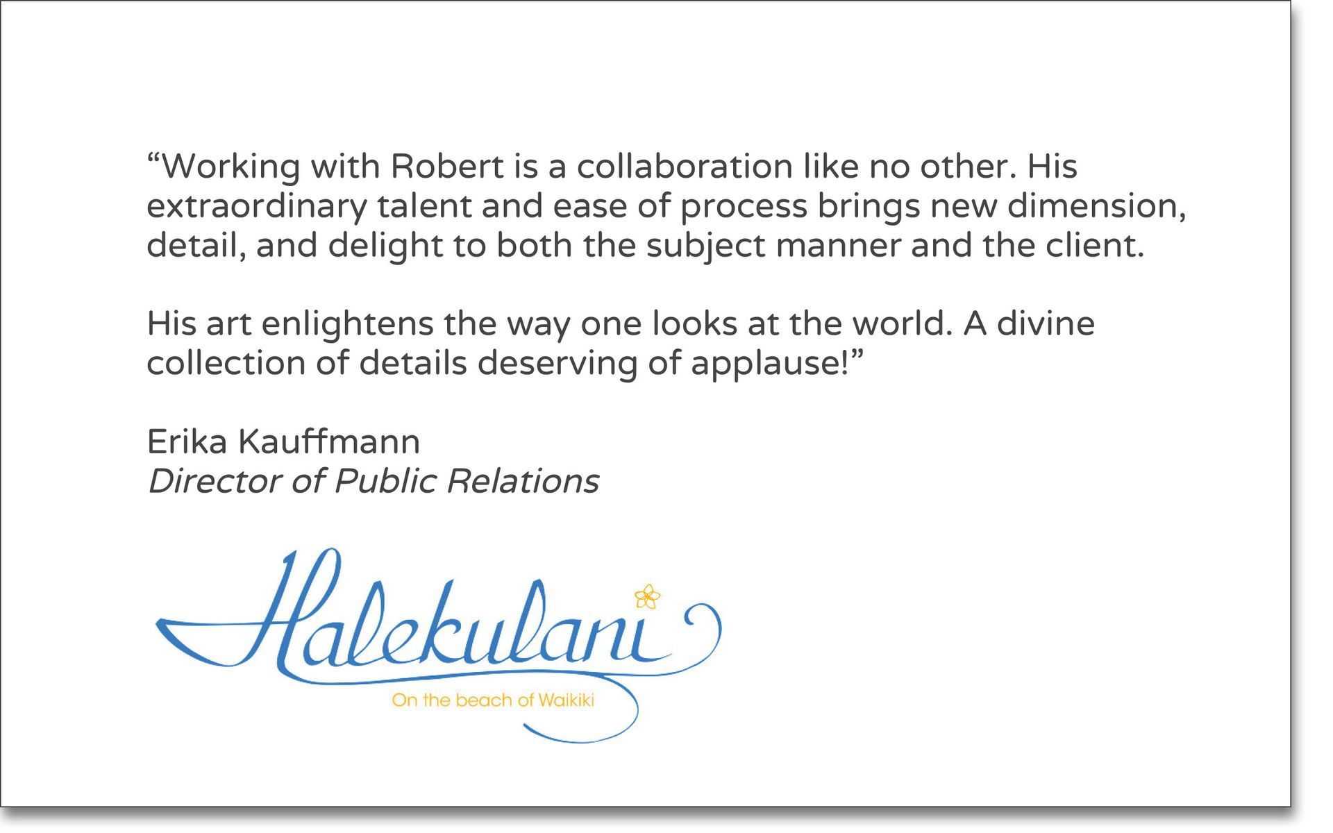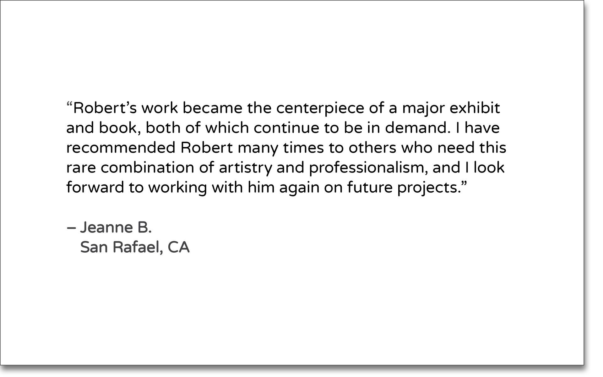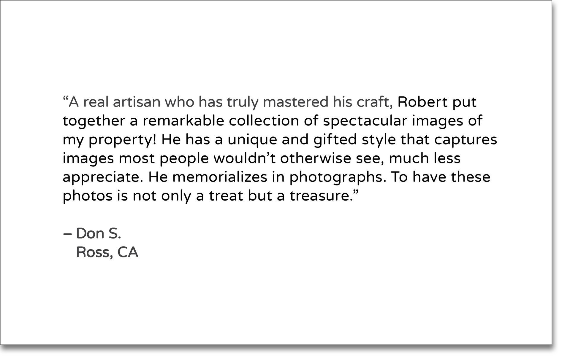 “The quality of the work is excellent. Over many years, Roban's done family portrait sessions, head shots and larger site specific commercial and residential photography commissions for us and all have produced wonderful results. He's always engaging and professional and very easy to work with. His eye for detail and capturing individuals or creative & interesting aspects of places & venues is a delight. Provides terrific value for the services — highly recommend!"