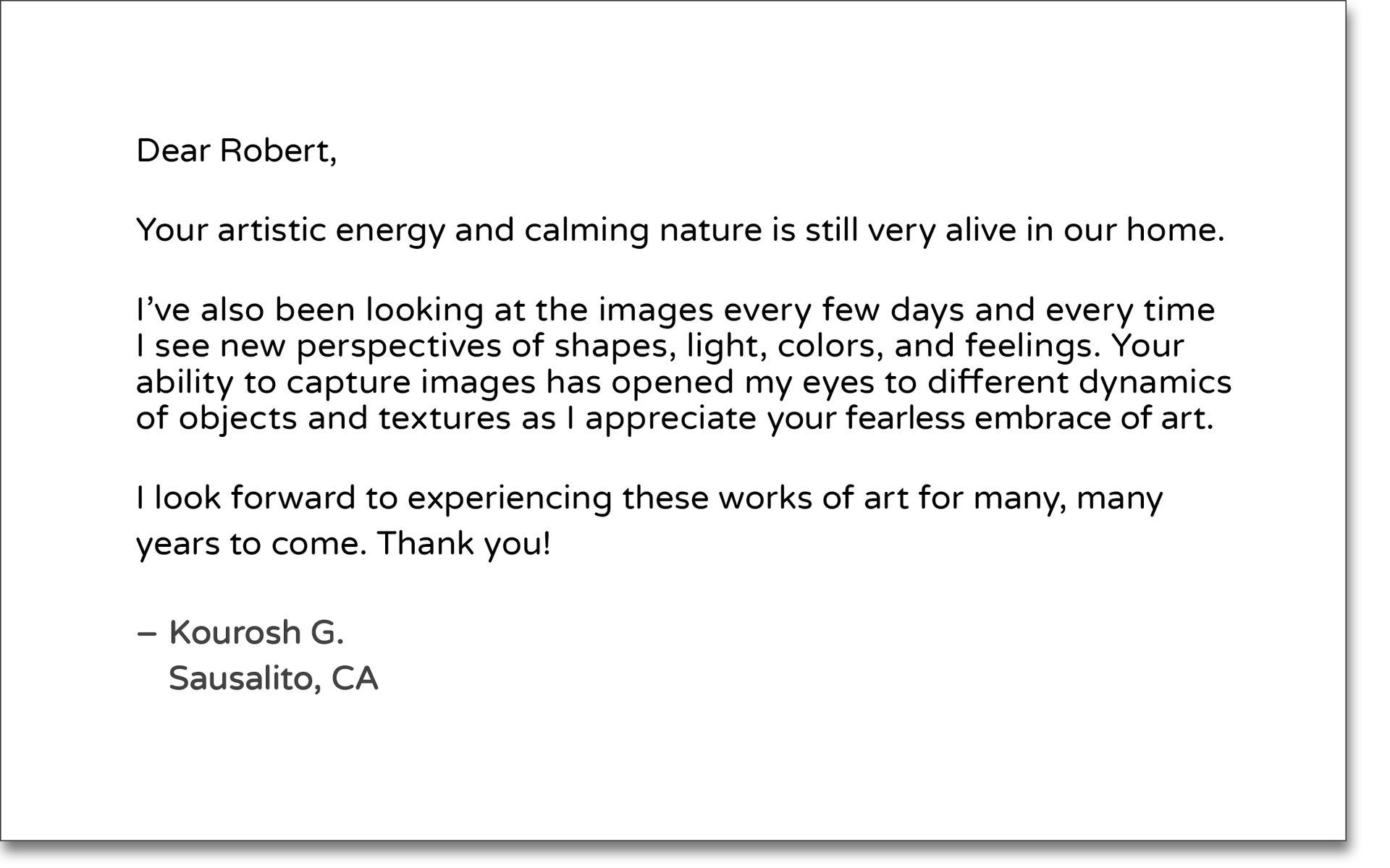 "I believe there's a difference between an artist and a visionary. Roban is a visionary. His work is from an angle of artistry it wouldn't even occur to me to look for. I have several of his pieces, all in places of honor in my home. An honorable, eye-opening and reliable experience, always."